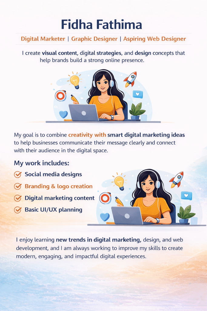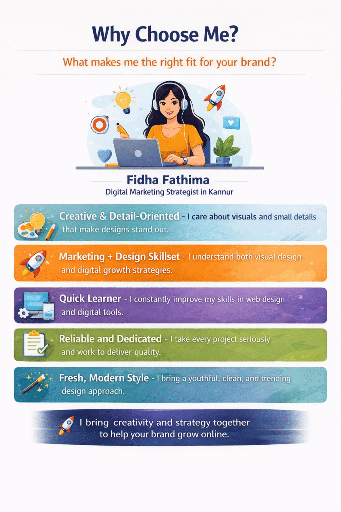 I am Fidha Fathima, a Digital Marketing Strategist in Kannur, Digital Marketer, Graphic Designer, and aspiring Web Designer. I create visual content, digital strategies, and design concepts that help brands build a strong and effective online presence in today’s competitive digital world.